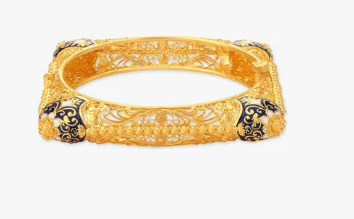 Bengali artistry in every curve! This square shaped 22 Karat gold set of two kankan Bangles Features Alpona inspired Batik motifs, intricate filigree work, a festive antique yellow finish, and bold blue and ivory Meenakari detailing, brought to life with katai craftsmanship and delicate wire artistry.
